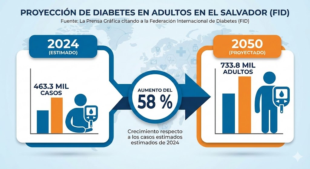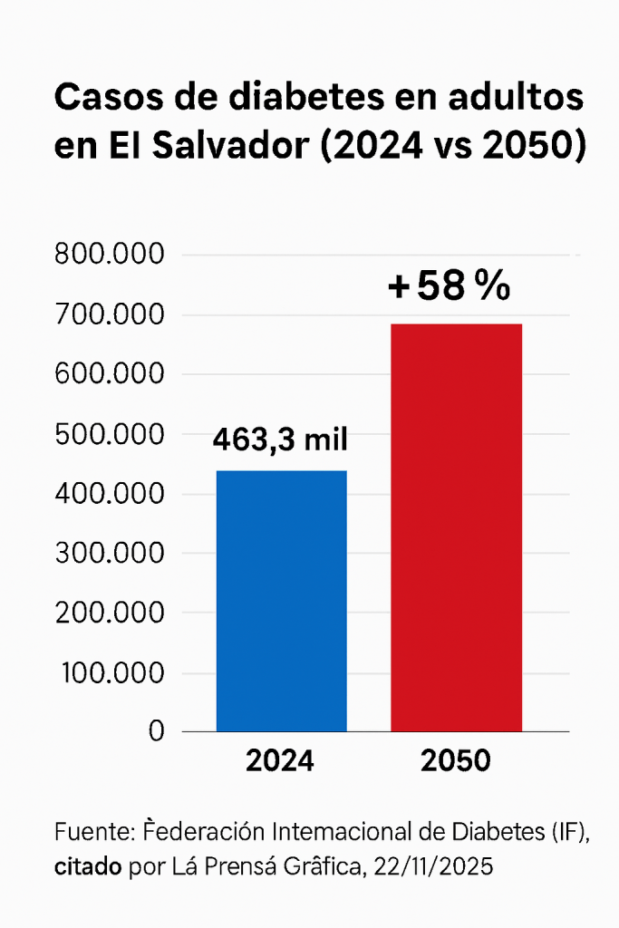 Según datos de la Federación Internacional de Diabetes (FID), citados por La Prensa Gráfica en su edición de hoy, El Salvador podría alcanzar 733.8 mil adultos con diabetes para el año 2050, lo que representa un aumento del 58 % frente a los 463.3 mil casos estimados para 2024.